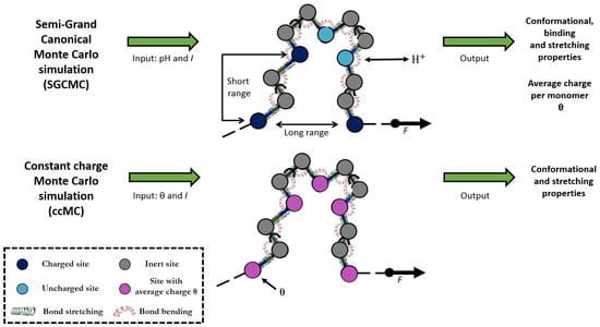 In order to explore the effect of CR and CF on the structural and stretching properties of a single linear weak polyelectrolyte, we make use of a Semi-Grand Canonical Monte Carlo (SGCMC) code previously developed by our group [,]. This program has been recently used to study the possibility of inducing CR by means of mechanical stretching []. Since in the present work we are particularly interested in the behavior of the system when CR and CF are turned on and off, the code has been modified in order to perform both constant-pH (SGCMC) and constant charge Monte Carlo (ccMC) simulations, as outlined in Figure 1. In SGCMC simulations, the pH is the control variable and CR is explicitly taken into account. Statistical averages of the conformational, stretching and binding properties are computed and they are pH-dependent. The average charge per monomer is defined as