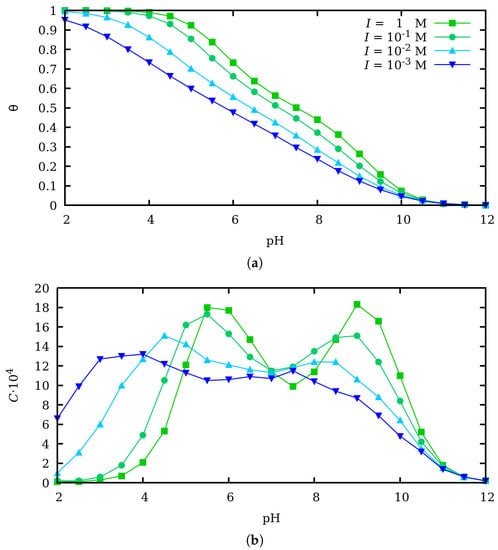 Conversely to SR, LR interactions are described by the DH potential, which is strongly dependent on the ionic strength. LR interactions tend to destroy binding correlation between neighboring sites and it is more amenable to mean-field treatments. This is reflected in the shape of the titration curves when the ionic strength decreases, which becomes flatter and the plateau at progressively disappears. The differences between SR and LR interaction can be better understood by computing the binding capacitance C as a function of the pH-value, which is shown in Figure 2b. As expressed by Equation (11), C allows to directly quantify the intensity of charge fluctuations. It can be observed that, for large ionic strength, C presents two maxima at and , which correspond to the inflection points in the titration curve and a maximum in the charge fluctuation. Furthermore, a minimum value is observed at , related to the presence of the “ordered” alternating state at . When the ionic strength decreases, C becomes progressively wider and flatter until the maxima and the minimum disappear as a result of the decorrelation introduced by LR interactions.