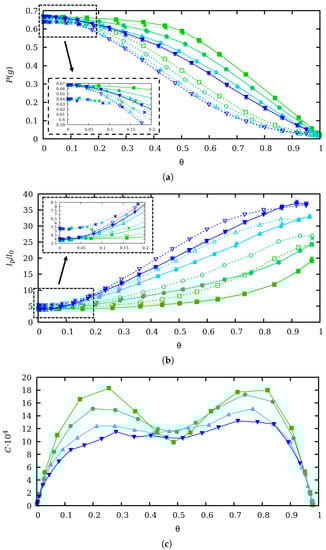 (a) gauche state probability, P(g), (b) persistence length and (c) binding capacitance C vs. the average degree of protonation at ionic strengths (from top to bottom) 1 M (green squares), 0.1 M (turquoise circles), 0.01 M (uppwards cyan triangles) and 0.001 M (downwards blue triangles). is normalized to the equilibrium bond length Å. Filled markers correspond to SGCMC without excluded volume, while empty markers correspond to ccMC simulations. In Figure 3a,b, star-shaped markers denote results obtained with SGCMC but they include steric excluded volume effects. The low charge regime is amplified in the insets of Figure 3a,b.