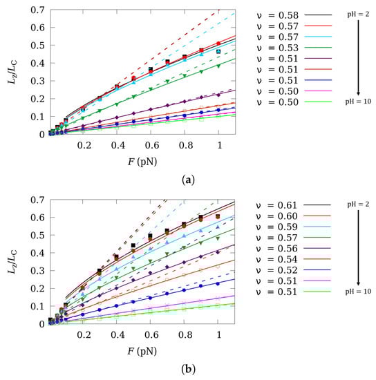 The extension/force curves resulting from SGCMC simulations (markers) are shown in Figure 4 for pH-values ranging from 2 to 10 (from top to bottom). Dashed lines are obtained solving Equation (17) using the value from simulations at zero force, at the corresponding pH and I values. The best fit of Pincus scaling law Equation (18) (continuous lines), in its range of validity pN, is also plotted. Two ionic strengths are considered: M (Figure 4a) and M (Figure 4b). For large pH-values that is, when the polyelectrolyte is neutral, and linear behavior is found for all the force-values. In the other limiting situation, for very low pH-values, when the polyelectrolyte is fully charged, simulations deviate from the linear behavior and they follow the Pincus scaling law (Equation (18)) with , which nicely matches with the theoretical predictions []. The presence of SEV does not affect this conclusion, as shown in the Supplementary Materials.