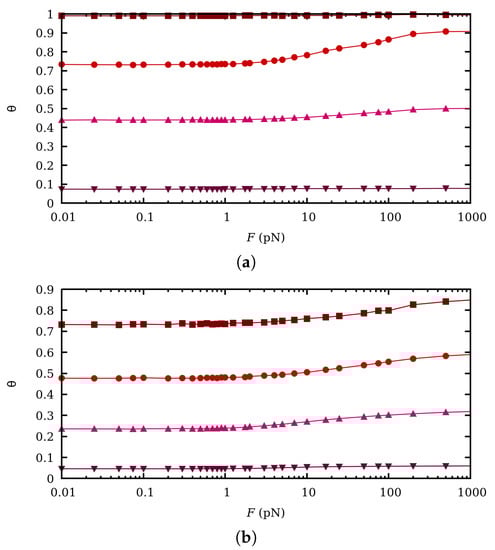 It is well-established that conformational and binding degrees of freedom in weak polyelectrolytes are highly correlated because of charge regulation. Since in flexible polyelectrolytes, mechanical stretching dramatically changes the distance within the macromolecule, changes in are expected when an external force is applied. This effect has been extensively discussed in a recent publication []. versus force is plotted in Figure 6 at different pH-values (4, 6, 8 and 10) and for two ionic strengths M (Figure 6a) and M (Figure 6b). For intermediate pH-values and low ionic strengths, moderate CR is observed. This effect is significantly enhanced if the gauche bond state is favored, for instance, because of the formation of a hydrogen bond, although this issue is out of the scope of this work. Although this point would probably require a more intensive study, we present here some preliminary results.