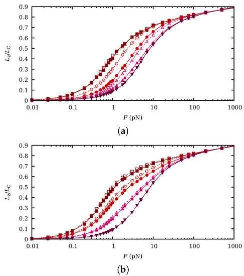which is a direct consequence of the fluctuation-dissipation theorem []. The Kuhn length is related to the persistence length as []. It is important to note that , as it will be shown in the next section, can only be considered constant in the low force regime. This fact is due to the activation of the rotational degrees of freedom at intermediate forces []. For forces ranging pN, the action of electrostatic self-avoiding interactions makes the force/extension curve to follow the Pincus scaling law [,,]