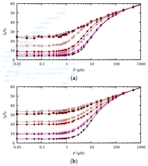 Normalized persistence length versus force at pH-values (from top to bottom) 4 (wine squares), 6 (red circles), 8 (uppwards pink triangles) and 10 (downwards purple triangles) and ionic strengths 1 M (a) and 0.001 M (b). Filled markers correspond to SGCMC while empty markers refer to ccMC. is normalized to the equilibrium bond length Å.