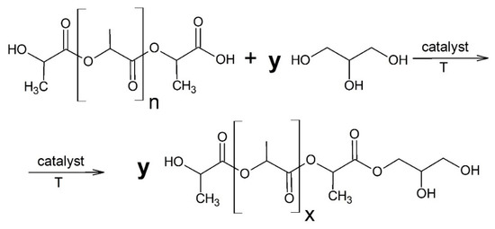 Glycerolysis reaction of poly(lactic acid) [n = y·x].