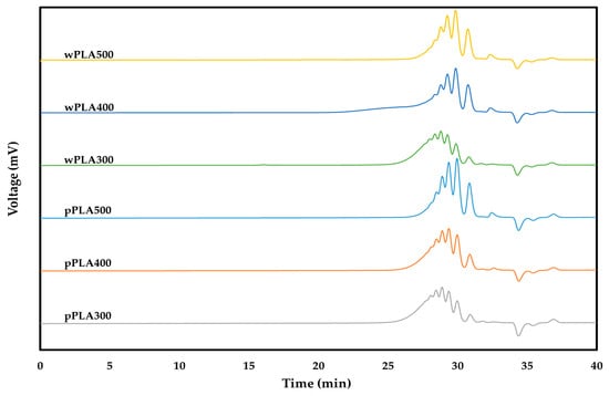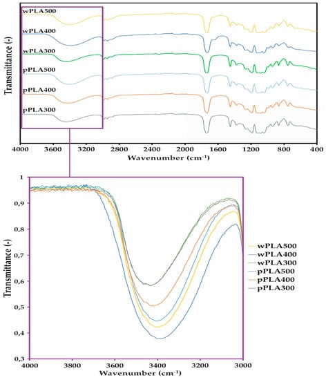 Analysis of FTIR spectra of PLA-based polyhydric alcohols (Figure 4) showed that there were characteristic bonds of the structure of lactide esters. The spectra of these new compounds showed high band intensity at 3400 cm−1, which indicated the presence of O–H bonds in the hydroxyl groups. Bands at 2880–3000 cm−1 (stretching) and 1360–1460 cm−1 (deformational) belonged to the C–H bond of the –CH2– and –CH3 group in lactic acid monomers and in glycerol. Bands at 1640–1760 cm−1 (stretching) belonged to the C=O bond of the ester group between lactic acid monomers or lactic acid and glycerol, bands at 1050–1270 cm−1 (stretching) belonged to the C–O bond of the ester group, and bands at 870–930 cm−1 to the free carboxyl group (at the end of the chain of oligomer) that has not reacted with glycerol [41,42,43,44]. Practically, the only changes in the presented FTIR spectra were observed in the wavenumber range of 3200–3400 cm−1, i.e., in the characteristic range for the vibrations of O–H bonds of hydroxyl groups. These bands had clearly different intensities. The bands for the wPLA500 and pPLA500 spectra had the highest intensities, while the lowest intensities were for wPLA300 and pPLA300 spectra. This was mainly due to the change in the content of free hydroxyl groups in these compounds. The highest content of these groups was in the compounds in which the highest amount of glycerol was used for the synthesis (PLA500 series). This is consistent with the determination of the hydroxyl values of the obtained oligomeric polyhydric alcohols (Table 3).