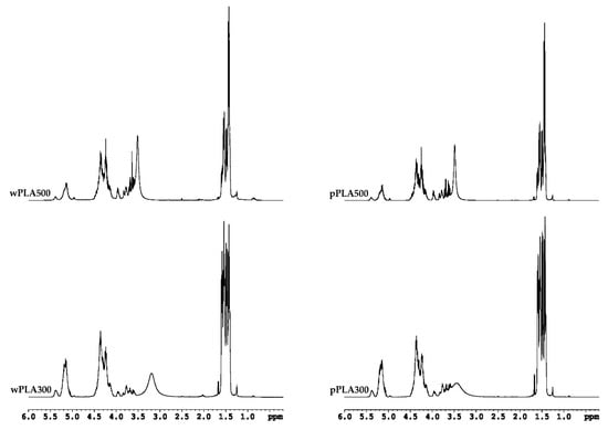 Analysis of new PLA-based compounds in nuclear magnetic resonance spectroscopy 1H NMR and 13C NMR confirmed the expected chemical structure (Figure 2). Selected NMR spectra are presented in Figure 5 and Figure 6.