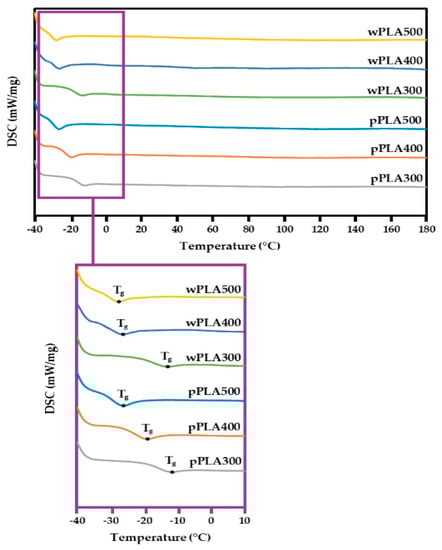 The appearance of the glass transition temperature (Tg) in the negative temperature range was observed in each of the analyzed compounds (Figure 7). The range of glass transition was from −11.8 to −29.2 °C. This temperature changed depending on the glycerol content in the initial reaction mixture. Tg’s were the lowest at a mass ratio of PLA to glycerol equal to 1:0.5. They were −29.2 °C for wPLA500 and −26.3 °C for pPLA500, respectively. This was mainly due to the presence of shorter and more mobile oligomeric chains that could more easily move relative to each other. The reduction of the glycerol content resulted in increasing glass transition temperatures to −12.3 °C for wPLA300 and −11.8 °C for pPLA300, respectively. This was due to the obtaining of longer and less mobile oligomeric molecules, which could be much more difficult to move relative to each other. The glass transition temperature also depended on the molecular weight. An increase in this parameter (Table 5) resulted in an increase in Tg. It can be stated based on the differential scanning calorimetry analysis that the obtained compounds are stable at higher temperatures and do not undergo any undesirable changes. This is important when using these glycerolysates for the synthesis of polyurethane materials. Then, they are exposed to high temperatures (e.g., 150 °C when synthesizing rigid polyurethane/polyisocyanurate foams) [56].