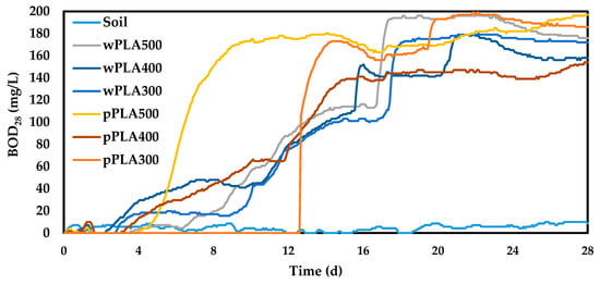 A major problem of the current world is the faster and faster increase in the consumption of polymeric materials, and thus also the increase in the production of waste. Poly(lactic acid) belongs to the group of biodegradable polymers of mainly natural origin. Therefore, it is assumed that products obtained on its basis will also be susceptible to biodegradation under forced conditions [57,58]. The biodegradability tests of synthesized polyols in soil environment were conducted using the OxiTop Control S6 apparatus to confirm this assumption. Liquid samples were added to the vessel (bottle of apparatus) in which the soil solution was previously prepared. BOD changes for the analyzed samples were monitored for 28 days. The course of BOD changes during the measurement is shown in Figure 8.