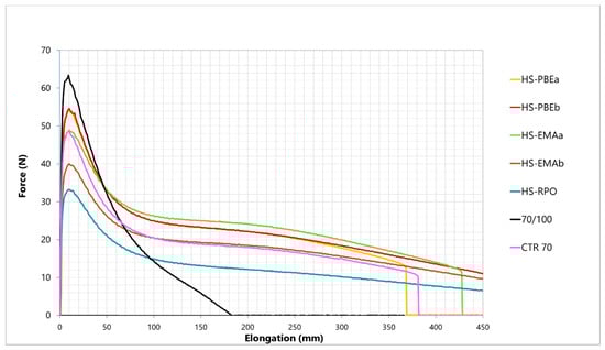 As expected, all systems exhibit a ductile-like behaviour characterised by an early sharp peak (yield point) in the elongation process followed by a smooth decrease during the plastic deformation period until the rupture point. Even though neat bitumen presents the highest maximum at the yield, the force declines sharply and breaks very rapidly after the yield drop. Despite the fact that CTR70 does not strictly fulfil the breaking criteria, its force-ductility behaviour is very close to the hybrid systems and, in addition, its cohesive energy (area below the resulting force-distance function calculated between 200 and 400 mm, Table 3) is clearly above the values typically required for a polymer modified bitumen (at least 2 J·cm−2). Therefore, taking into account that remaining CTR particles usually act as crack initiators leading to a premature breakage during elongation [], this result hints at an enhanced digestion of CTR and, therefore, a better homogeneity of the rubberised bitumen. In general, according to Figure 1 and Table 3, no direct correlation between the type of polymer and force ductility results can be established, although HS-PBEb and HS-EMAa show the best results in terms of stiffness and cohesion energy.