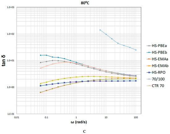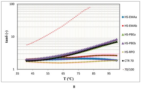 Finally, Figure 3B also allows distinguishing two types of rheological behaviours after polymer addition. On the one hand, CTR70 and HS-PBEs present curves with similar qualitative evolution with temperature than neat bitumen, characterised by a continuous increase of the loss tangent, a prevailing viscous behaviour (tanδ > 1) and the absence of the “plateau” region, over the entire temperature interval tested. Hence, a direct transition from the glassy to the Newtonian region is a distinctive characteristic of these non-reactive systems. On the other hand, for reactive systems (HS-EMAs and HS-RPO), loss tangent curves become virtually independent of temperature getting values close to 1, which is considered the rheological response of a critical gel [].