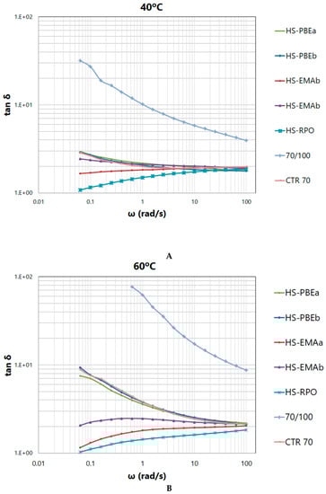 In addition, as loss tangent presents greater sensitivity to modification changes, Figure 3B may be used to quantify the contribution of every polymer to the global rheological response of the HSs, in the sense that, the lower the values of tanδ, the better the modification effect is.
