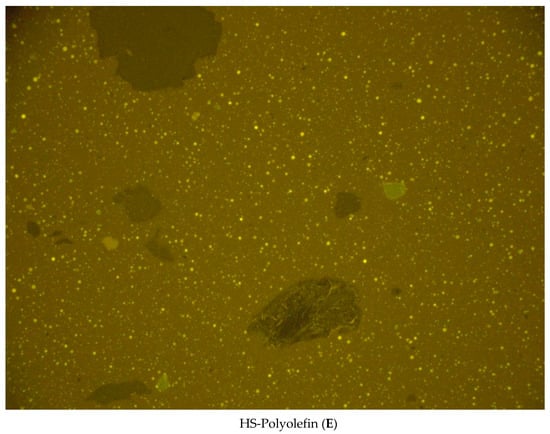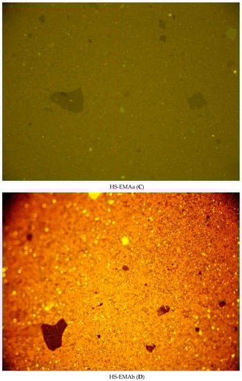 From previous results, it is clear that different improvement degrees are found after the modification of the rubberised bitumen, depending on the type of polymer used. The thermomechanical behaviour of HSs could be explained by the development of a complex multiphasic system formed by polymeric phases of a different nature [], as may be supported by fluorescence microscopy (Figure 8).