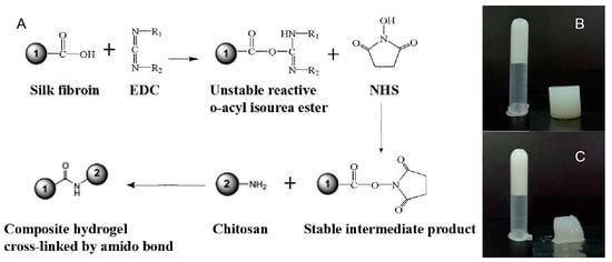 Synthesis of silk fibroin (SF)/chitosan (CS) hydrogels. (A) Cross-linking mechanism, (B) schematic representation of SF/CS hydrogel with mass ratio of 7/3, (C) schematic representation of NSF.