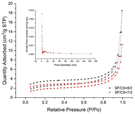 In view of the ultimate application as scaffolds for delivering drugs or housing fluids from the surrounding tissues, porous structure is essential. The N2 adsorption–desorption isotherms and pore size distributions of hydrogels at mass ratios of 8/2 and 7/3 are shown in Figure 3. The isotherms of hydrogels exhibited a type-II curve according to the IUPAC classification (macroporous: Pore diameter > 50 nm; mesoporus: Pore diameter between 2–50 nm; microporus: Pore diameter < 2 nm), which indicated the macroporous structure. The specific surface area was calculated to be 12.53 m2/g (SF/CS = 8/2) and 9.62 m2/g (SF/CS = 7/3) based on the BET method. The 8/2 hydrogel had larger specific surface area than that of the 7/3 hydrogel. Moreover, the BJH method for the pore size distribution showed that the pore size was centralized at approximately 15.45 nm (SF/CS = 8/2) and 11.27 nm (SF/CS = 7/3), indicating the existence of mesopores. The results demonstrated that macroporous and mesoporous structures existed in the internal structure of hydrogels simultaneously.