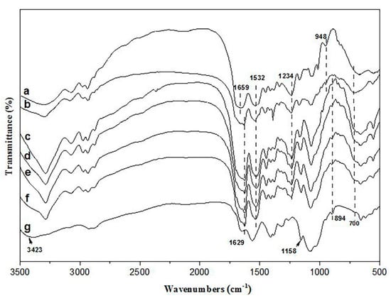FTIR spectra. (a) NSF, (b) SF/CS = 10/0, (c) SF/CS = 9/1, (d) SF/CS = 8/2, € SF/CS = 7/3, (f) SF/CS = 6/4, (g) chitosan.
