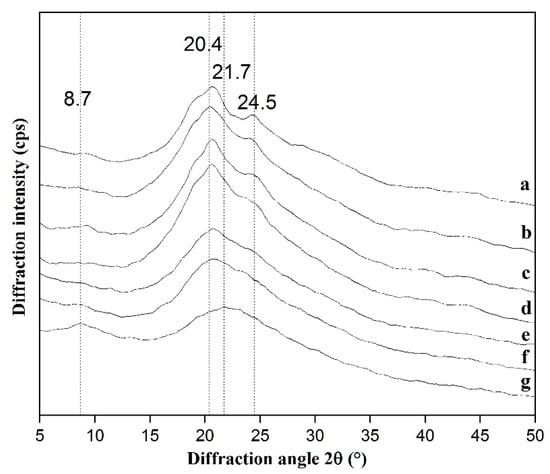 X-ray diffraction (XRD) was applied to analyze the condensed state structure of silk fibroin, including three molecular chain conformation (silk I, silk II, and random coil) and two crystal type (α-helix and β-sheet) []. There was a diffraction peak near 21.7°and 8.7° in CS (curve g in Figure 5), indicating CS had some crystalline areas and its molecular structure was dominated by amorphous structure []. The curve of NSF (curve a in Figure 5) had a sharp diffraction peak at 20.7° (silk II) and a weak peak near 24.5° (silk I), which meant NSF had the crystalline structure of silk II. With the addition of chitosan, the peak at 24.5° (silk I) gradually disappeared, while the diffraction peak at 20.4° (silk II) still existed. Hence, silk II (β-sheet) was the main structure in the SF/CS hydrogels, and it was consistent with the results of FTIR.