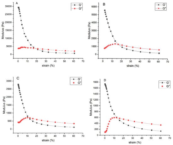 Rheological properties of hydrogels. (A) SF/CS = 9/1, (B) SF/CS = 8/2, (C) SF/CS = 7/3, and (D) SF/CS = 6/4.