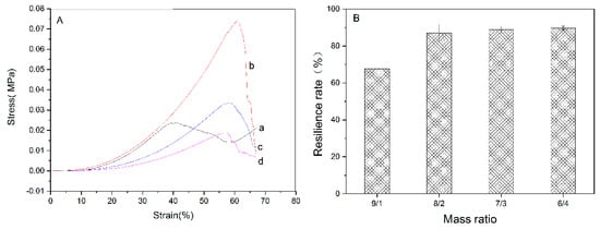 Mechanical properties. (A) Stress–strain curves. (a) 9/1, (b) 8/2, (c) 7/3, and (d) 6/4, (B) resilience rate.