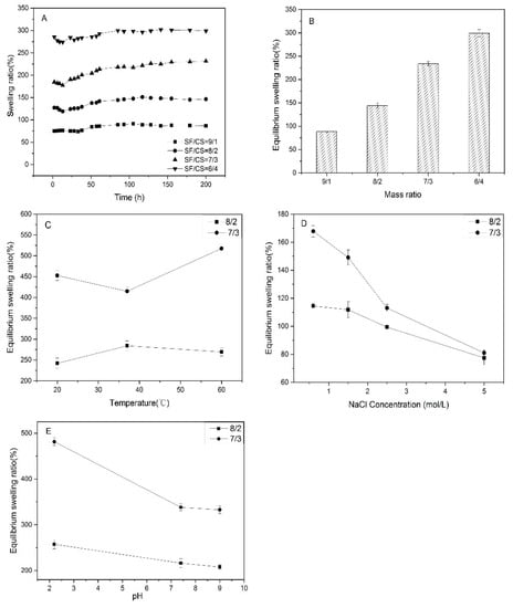 The stimulus responsiveness of swelling performance was determined by comparing the swelling behaviors of SF/CS composite hydrogels with mass ratios of 8/2 and 7/3 at different temperatures, pH, and ionic concentrations. Temperature (37 °C), pH (2.2, 7.4), and low ionic concentration of the swelling medium were applied to simulate the physiological environment of human body. The hydrogel with higher crosslinking density attained more compact structure, which decreased the ESR []. The ESR of the SF/CS composite hydrogel (Figure 8C) has no linear relationship with changes in temperature. In previous studies, SF or CS temperature-responsive hydrogels were formed by modifying the structure of SF/CS or blending with other temperature-responsive materials [,]. The ESR of SF/CS composite hydrogel (Figure 8D) decreased remarkably with the raise of the concentration of NaCl. As the swelling medium, NaCl solution contains a large number of free ions, which increased the osmotic pressure of the swelling medium and minimized the inward movement of solvent solution []. After the combination of hydrogel with hydrated cations, electrostatic repulsion force generated between hydrogel and free ions, which made the structure of hydrogel network shrink. A decrease in ESR was observed when the pH value of PBS increased (Figure 8E), which proved the pH stimuli responsiveness of the SF/CS hydrogels. Both SF and CS had positive charges when the pH was 1~3 [], which made the molecular chains of hydrogels generate electrostatic repulsion and led to the higher ESR. When the pH was 4~14, SF had negative charges instead and exhibited electrostatic attraction with CS. Hence, the internal structure of hydrogels was compact and uneasy to swell.