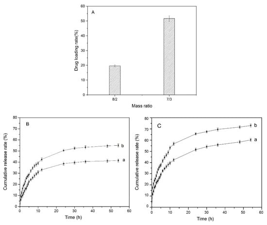 The in vitro drug release behaviors of SF/CS hydrogels at mass ratios of 8/2 and 7/3 in PBS as release medium were studied. In Figure 9A, the drug loading rate of the 7/3 hydrogel (>50%) was obviously higher than that of the 8/2 hydrogel (20%). In light of the way to load drug, the drug loading rate is largely related to the swelling performance. As is known in the analysis of swelling performance, the 7/3 hydrogel has higher ESR, so that it has more space in the internal structure of hydrogel after swelling and can contain more drug solution.