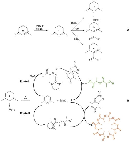 Following all experimental temperatures investigated here, working at 170 °C represents the best optimal conditions in terms of kinetics and control over the reaction. Considering that control experiments demonstrated that MgCl2 or free NHC 1 could not induce reasonable polymerizations (Table 1), a dual catalytic mechanism supporting the very high activity of 2 is proposed here. The concept of dual catalysis, where a Lewis acid supports a nucleophile to gain an increased catalytic effect, is not new and has already been reported several times in organic chemistry [26,27] and in polymerization catalysis [27,28]. NHC-adducts with MgCl2, serving as latent catalysts, have already been reported by Dove for the polymerization of lactones at high temperatures [28]. Inspired by their work, a cooperative action mechanism involving the dissociation of complex 2 at high temperature is here proposed (Figure 1B). Interestingly MALDI-ToF mass spectrometry evidenced the presence of both cyclic and α-hydroxy-ω-carboxy-linear PLA species (Figure S1 in Supplementary Materials). Such an observation tends then to indicate that during the reaction, the lactide monomer is activated by the MgCl2, and that the free NHC 1 can act both as a base (Figure 1B, route I) and a nucleophile (Figure 1B, route II). Therefore, the route I generates linear chains initiated by water impurities via a cooperative catalysis, while route II essentially leads to cyclic structures through a cascade catalysis.