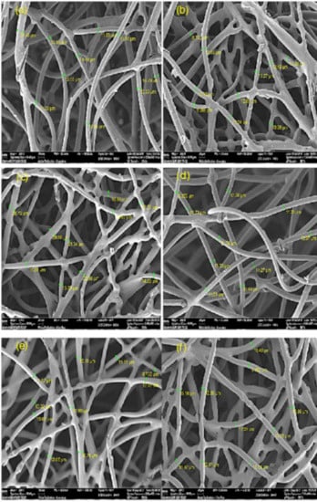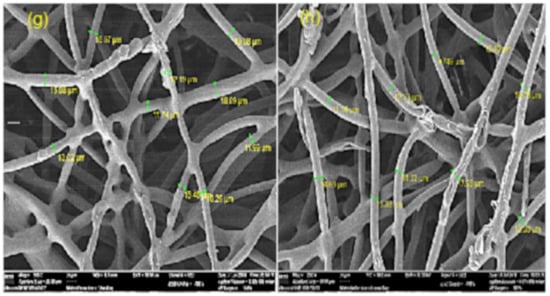 Imaging onto the amine immobilized GMA-g-NWF and IRP samples that functionalized with the amines were carried out in order to observe the changes in terms of morphology before and after crosslinking process, respectively. The images obtained shown in Figure 2. The average diameter of the pristine sample was around 12.42 µm. The GMA-g-NWF sample obviously increases almost up to 13.44 µm. The increase in the diameter of the pristine sample after the grafting was due to the coating of the poly-GMA thin layer [27]. Moreover, the average diameter of GMA-g-NWF samples increases further after functionalization with a different aliphatic amine. The average diameter obtained for EDA-GMA-g-NWF, DETA-GMA-g-NWF, TETA-GMA-g-NWF, and TEPA-GMA-g-NWF was around 14.07, 18.91, 13.10 and 13.83 µm, respectively. This indicates the incorporation of the amine group on the epoxy group of GMA via the functionalization process [25]. Among four types of an aliphatic amine, DETA had shown the highest gain in term average diameter. On the other hand, after the crosslinking process, all the IRP samples a slight reduction in average diameter in comparison to amine immobilized GMA-g-NWF. The average diameter obtained for EDA-IRP, DETA-IRP, TETA-IRP, and TEPA-IRP was around 12.45, 12.48, 13.06 and 13.71 µm, respectively. Typically, when the polymer is subjected to radiation, two types of reaction, namely crosslinking and degradation, will occur [28]. The polymers mutually shrunk due to bonding of the polymer chains in the initial stage of radiation crosslinking, resulting from decreasing in average diameter after the crosslinking process. The differences in average diameter EDA-IRP, DETA-IRP, TETA-IRP, and TEPA-IRP were insignificant. Moreover, enormous weight loss also was not observed after radiation treatment which indicates that no occurrence of chain scission during the process.