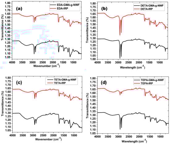 FTIR spectra of (a) EDA-GMA-g-NWF and EDA-IRP, (b) DETA-GMA-g-NWF and DETA-IRP, (c) TETA-GMA-g-NWF and TETA-IRP, (d) TEPA-GMA-g-NWF and TEPA-IRP at experimental condition of 70% amine: 30% isopropanol, 60 °C, Dg ~100% and 2 h.