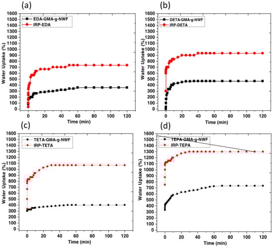 Water uptake capacity of (a) EDA-GMA-g-NWF and EDA-IRP, (b) DETA-GMA-g-NWF and DETA-IRP, (c) TETA-GMA-g-NWF and TETA-IRP, (d) TEPA-GMA-g-NWF and TEPA-IRP at experimental condition of 70% amine: 30% isopropanol, 60 °C, Dg ~100% and 2 h.