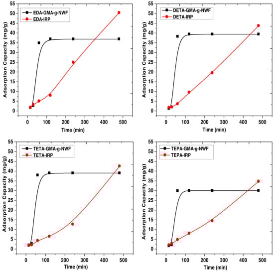 The adsorption capacity of both type samples was investigated. The result obtained for Cu adsorption is shown in Figure 6. The complete experimental data for adsorption capacity of both Cu and Pb is provided in the Supplementary Materials. The experimental conditions of the amine functionalization process were predetermined to attain AD approximately 2.0–2.2 mmol/g−ad provided standardized condition was applied for adsorption experiment. The adsorption capacity of Cu for both amines immobilized GMA-g-NWF, and IRP samples were measured against adsorption time. The adsorption capacity of EDA-GMA-g-NWF towards Cu ion increases significantly for the initial 60 min, but after that, the adsorption capacity reaches almost plateau. The adsorption capacity EDA-GMA-g-NWF at first 15 min of adsorption was around 1.60 mg/g which increases up to 34.85 mg/g after 60 min of the process. The active sites present onto EDA-GMA-g-NWF more likely actively occupied during the initial stage of the adsorption process. However, subsequent saturation in adsorption of Cu ion merely takes place due to the exhaustion of active sites onto EDA-GMA-g-NWF [35]. The saturation is resulted from the simultaneous adsorption of Pb, suggesting possible competitive effect towards the active sites between Cu and Pb. A similar trend was attained for DETA-GMA-g-NWF, TETA-GMA-g-NWF, and TEPA-GMA-g-NWF samples as well. The adsorption capacity of amine immobilized GMA-g-NWF samples decreases as the aliphatic amines chain grows greater. The adsorption capacity towards Cu ion reduces with a trend of EDA-GMA-g-NWF < DETA-GMA-g-NWF< TETA-GMA-g-NWF < TEPA-GMA-g-NWF. These findings strongly related to the size of aliphatic amines. Since the EDA possesses the smallest size, thus the migration of EDA onto epoxy groups of GMA takes place in abundant in comparison to other aliphatic amines [4]. Another main reason for the reduction of adsorption capacity towards Cu ion as the number of amines increased from 2 to 5 is related to the covalent interactions relative to the ionic interactions during the competitive adsorption between Cu and Pb. Wang F. et al. [36] discussed the effect of the covalent index in their study, and they found out that Pb has a larger covalent index of 6.41 than Cu (2.64), which resulted in Pb having stronger interaction to the nitrogen and oxygen atoms to form complexes than Cu. This explained the reason of reduction in adsorption capacity towards Cu as aliphatic amines chain grows greater.