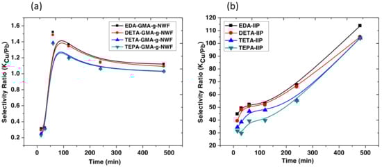 Selectivity ratio of amine immobilized (a) GMA-g-NWF and (b) IRP samples versus time at experimental condition of initial Cu concentration: 10 mg/L, adsorbent dose: 0.02 g, temperature: 30 °C, amine density: 2.0–2.2 mmol/g-ad, stirring speed: 200 rpm and adsorbate volume: 100 mL.