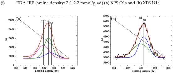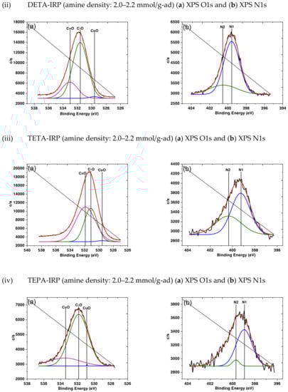 X-ray photoelectron spectra of the IRP samples after adsorption with Cu ion was analyzed to verify the presence of metal ion into the polymer matrix. Thus, only the IRP samples subjected to XPS analysis. O1s and N1s orbitals were detected in EDA-IRP, DETA-IRP, TETA-IRP, and TEPA-IRP samples. The result obtained showed in Figure 8i–iv. Strong peak was observed at 399.48 eV and 400.37 eV in the N1s and N2s, which indicates primary and secondary amine groups of EDA, DETA, TETA, and TEPA, respectively [40]. The O1s spectrum of EDA-IRP, DETA-IRP, TETA-IRP, and TEPA-IRP samples shows the presence of oxygen bonding as such C–O and C=O at a binding energy of 531.70 and 533.22 eV, originating from the functional monomer, GMA [41]. The O1s spectrum of all IRP samples exhibits a broad distribution at higher binding energy due to the presence of oxygen bonded carbon and Cu concurrently in the IRP samples. The main peak at 531.70 eV attributes to the present of C–O along with binding energy at 530.30 eV indicates the existence of CuO. The XPS performed onto IRP samples had verify the chemical concentration of the samples after adsorption of Cu ion into polymer matrix. Conclusively, clear evidence was obtained on adsorption of Cu ions onto IRP samples which attribute to detection of CuO that allowed carbonyl groups from GMA to bond with.