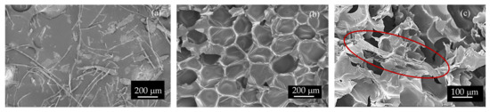 In Figure 1, field-emission scanning electron microscope (FESEM) images of (a) ground feathers (b) a neat biofoam and (c) a CF fiber located between foam cells are shown for size comparison purposes. Discussion regarding size distribution will be described in Section 3.2.