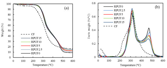 (a) TGA and (b) DTG of RPUF control and CF/RPUF with 2.5%–15% CF php.