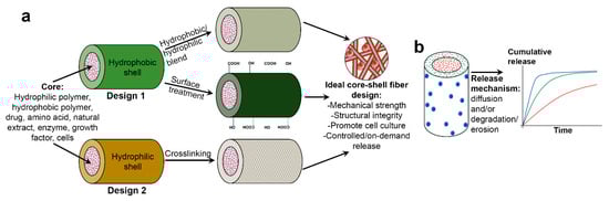 The choice of which shell material to use is, on the other hand, far from straightforward. Shell layer plays a crucial role in core–shell fiber design as favorable cell adhesion and biomolecules release strategy are highly dependent on the selection of shell material. Two general design approaches have been reported as depicted in Figure 1a. In the first approach, hydrophobic polymer was preferred as shell material to take advantage of the slower degradation and/or erosion of the shell layer, hence reducing release rate of drug or bioactive molecules to achieve sustained and prolonged release. However, hydrophobic polymers also have been associated with low affinity towards cells, which will further decrease the applicability of the scaffolds in tissue engineering. Thus, balancing degradation rate and cell affinity is at the highest priority, and this is usually realized through hydrophobic/hydrophilic polymer blends [11,54,89,90] or post-fabrication treatments such as oxygen (O2) plasma treatment [30], laser ablation [91], and covalent immobilization of heparin [92].
