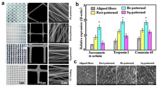 In another work, micropatterned fiber matrices were fabricated by deposition of coaxial electrospun fibers onto lithographic collectors to mimic myocardium anisotropic structure [32]. Prior coaxial electrospinning, three photomask patterns, including square (Sq-), rectangle (Rect-) and honeycomb (Hc-) patterns, were designed and printed using electron-beam mask lithography system as depicted in Figure 2a. The printed photomask was laid onto a glass substrate, followed by exposure to lithograph machine to obtain micropatterned circuits. These circuits were then used as collector during coaxial electrospinning. Carbon nanotubes (CNTs)-poly(ethylene glycol)-poly(DL-lactide) (PELA) core–shell Hc-patterned scaffolds exhibited higher strain to failure and ultimate tensile strength, as well as more spacious microenvironment compared to Sq- and Rect-patterns. In addition, Hc-patterned scaffolds showed higher cell viabilities and more formations of capillary-like networks during coculture of primary cardiomyocytes (CMs) with endothelial cells (ECs) and cardiac fibroblasts (CFs) (Figure 2b,c) [32].