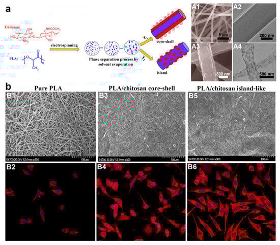 (a) Scheme illustrating the preparation of core–shell and island-like fibers through single electrospinning plus in situ phase separation. SEM and TEM images of core–shell and island-like structures are shown in A1, A2, and A3, A4, respectively. (b) SEM and laser scanning confocal microscopy (LSCM) micrographs of mouse preosteoblasts after 48 h cultivation on pure PLA fibers (B1, B2), PLA/chitosan core–shell fibers (B3, B4), and PLA/chitosan island-like fibers (B5, B6). Prior LSCM testing, mouse preosteoblasts were stained with tetramethylrhodamine isothiocyanate (TRITC)-labeled phalloidin and 4′,6-diamidino-2-phenylindole (DAPI). All LSCM micrographs are at 400× magnification. Reproduced from [125]. Copyright 2017 with permission from American Chemical Society.