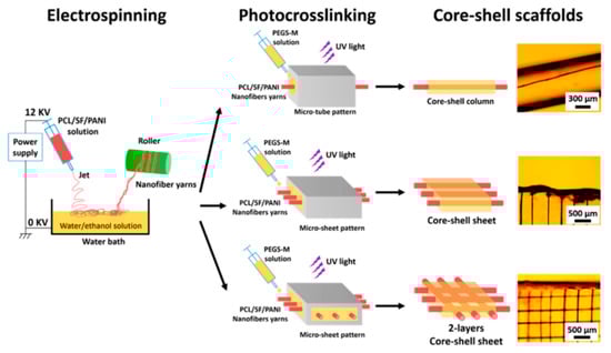 Alternatively, the preparation of core–shell fibers can also be realized through combination of single electrospinning and post-fabrication treatments such as UV photocrosslinking [68], metal sputtering, and electrochemical deposition [127], as well as reoxidation with thermal pretreatment [128]. Wang et al. [68] reported the preparation of core–shell-based fibrous and sheet composite scaffolds by encapsulating aligned nanofiber yarn (NFY) inside a UV photocurable hydrogel shell as portrayed in Figure 5. The aligned NFYs were comprised of PCL, SF, and polyaniline (PANI), and they were fabricated via dry–wet single electrospinning method (collected in water/ethanol bath before they were rolled using a rotating cylinder). For the subsequent preparation of core–shell fiber, a single NFY was encapsulated with poly(ethylene glycol)–co–poly(glycerol sebacate) (PEGS-M) in a poly-(dimethylsiloxane) (PDMS) microtube. A photoinitiator (Irgacure 2959) was added to PEGS-M solution initially, and photopolymerization of PEGS-M was achieved after exposure to UV irradiation (365 nm) at ~12 mW/cm2 for 30 s [68]. Similar photopolymerization procedure was performed to prepare mono- and bilayer core–shell sheets, which were later found to promote myogenic differentiation and induce formation of elongated myotube [68], demonstrating an ideal platform for skeletal muscle regeneration.