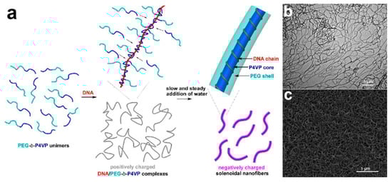Another fascinating and powerful strategy to produce core–shell fibers is through self-assembly. The principle of the technique is based on the ability of a structure to construct and organize itself from a collection of disordered precursor blocks [131,132]. An example of core–shell nanofibers production via self-assembly has been reported by Wang’s group (Figure 6) [131]. In their study, molecularly solubilized di-block copolymer poly(ethylene glycol)–b–poly(4-vinylpyridine) (PEG–b–P4VP) was used as precursor block for the designated self-assembly. Below critical water content (CWC), PEG–b–P4VP interacts with deoxyribonucleic acid (DNA) chain to form linear DNA/polymer complexes where each DNA chain was surrounded by P4VP chains. Upon gradual increase of water content, P4VP block chains were allowed to aggregate which eventually induces change conformation of the DNA chain, prompting it to surround the P4VP aggregates [131]. Ultimately, this led to the formation of monodisperse core–shell nanofibers. Self-assembly is attractive in a way that it avoids the need for the complex equipment setup. However, its complicated formation mechanism may prove challenging for its widespread uses.