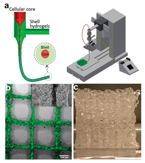 Despite its prevalent use, one of the main criticisms of coaxial electrospinning is its lack of ability to yield 3D core–shell fibrous scaffolds. Coaxial bioprinting has been reported as a promising alternative to fabricate core–shell fibers in 3D arrangement. In a work reported by Mistry et al. [45], three different cell-types (HepG2 cells, 3T3 mouse fibroblast (3T3) cells, and primary human umbilical vein endothelial cells (HUVECs)) have been incorporated separately in core–shell laden strands through coaxial bioprinting method (Figure 7). In this study, respective cell type was combined with core hydrogel which consists of type I rat tail tendon collagen, Matrigel, and methacrylated gelatin (GelMA), although poly(ethylene glycol) diacrylate (PEGDA), alginate, or PEGDA-alginate blend is used as shell gel [45]. The core–shell strands were then printed using a coaxial spinneret mounted on a commercial 3D bioprinter. The authors also reported successful incorporation of dual cells; HUVECs in the core and HepG2 cells in the shell layer of the 3D strands [45]. Currently, bioprinting technique is attracting ever-increasing attention as it allows formation of complex 3D geometries which is highly favorable for potential application as tissue scaffolds. However, despite its advancements, several bioprinting-related challenges are yet to be resolved. These include short shelf-life and storage issue of the bioink, slow printing process, and restricted mechanical strength of 3D scaffolds [139].