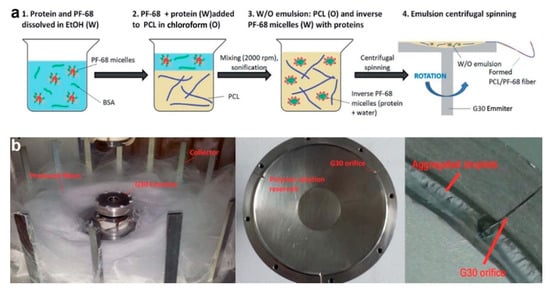Meanwhile, Buzgo et al. [50] developed another novel technique to prepare protein-embedded core–shell fibers through centrifugal spinning method. This technique was proposed as the solution to poor cell penetration which is commonly associated with electrospun fibers (caused by limited layer thickness and small pore size). Initially, a W/O emulsion was prepared by dropping platelet lyophylisates protein/Pluronic F-68 water phase into PCL oil phase, followed by sonication. The emulsion solution was then subjected to centrifugal spinning process at rotation speed of 11,000 rpm (Figure 8). This technique is based on force spinning technology, in which high centrifugal forces are generated during fast spinning, resulting in formation of fibers [50]. Similar to emulsion electrospinning, fast evaporation of oil phase solvent increases oil phase viscosity, which in turn forces protein-containing water phase to migrate towards the center of the fiber, hence producing core–shell structure. Although this method can produce core–shell fibers in nano-size in large volume, future development of aligned or patterned fibers might be difficult and challenging. In the meantime, the working principle, advantage, and limitation of other fabrication strategies of core–shell fibers are summarized in Table 2 below.