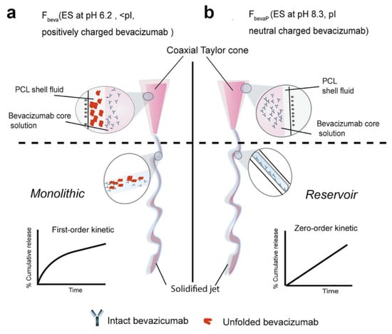 - Angkawinitwong, U.; Awwad, S.; Khaw, P.T.; Brocchini, S.; Williams, G.R. Electrospun formulations of bevacizumab for sustained release in the eye. Acta Biomater. 2017, 64, 126–136. [Google Scholar] [CrossRef] [PubMed]