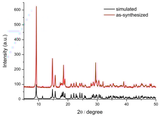 Figure 1 presents the PXRD patterns of simulated and as-synthesized Tb-BDC. The PXRD patterns of the Tb-BDC match well with simulated Tb-BDC, suggesting that the material was a successful preparation of simulated Tb-BDC [32]. The structure of (Tb2(BDC)3(H2O)4)n can be described as follows. Tb shows parallelepipedal coordination geometry by coordinating to six oxygens of BDC, in a monodentate fashion, and two water molecules to form an eight-coordinate Tb(III) center. The water molecules occupy the two faces of the parallelepipedal motif. PXRD patterns of simulated and as-prepared H2BDC were also performed (Figure S1, Supplementary Materials).