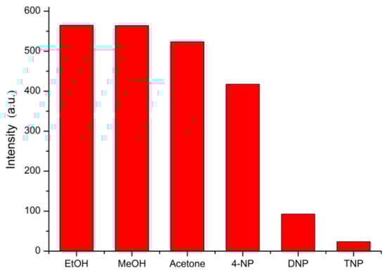 Anti-interference ability is one of the indicators for one luminescence sensor. As shown in Figure 7, when the Tb-BDC was used to detect the analytes, such as EtOH, MeOH, acetone, 4-NP, and DNP, the luminescence intensity of the Tb-BDC at 545 nm changed little or was unchanged compared to the original one. However, when commensurate TNP was added to the above analytes (2.5 × 10−4 M other analyte + 2.5 × 10−4 M TNP), the results show the luminescence was completely quenched, suggesting that the Tb-BDC has high selectivity for TNP.