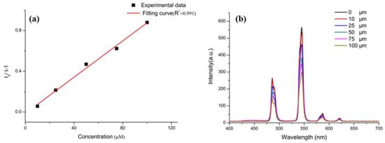 (a) Stern–Volmer plot in response to picric acid (TNP); (b) Concentration-dependent fluorescence quenching of Tb-BDC upon the addition of different concentrations of TNP.