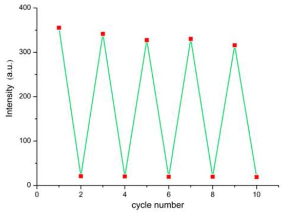 In addition, to investigate the recycle performance, the test paper covered with TNP was handled with water-washing and drying in air. As shown in Figure 8, for sensing TNP, after five washing–drying cycles, the test paper could still recover to 93% of the primitive luminescence intensity.