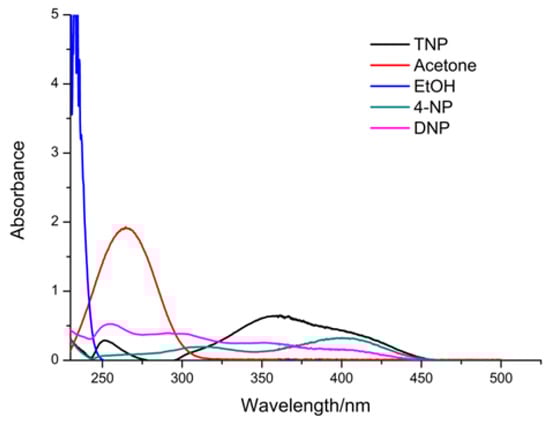 The UV absorption spectra of TNP reveals that it has a wide and strong absorbance range from 300 to 450 nm. The UV absorption spectra of the other small molecules was also performed. As shown in Figure 9, the absorbing range of TNP shows a higher extent of overlap with the absorption peak of the ligand. This implies that there was a competition of absorption of the light source energy between TNP molecules and the ligand. TNP absorbed most of the energy and only a small fraction of energy was transferred via the ligand to the Tb3+ ions. This also illustrates why other small organic molecules had different quenching effects on the Tb-BDC and why the luminescence intensity of the Tb-BDC was decreased or completely quenched upon the addition of TNP.