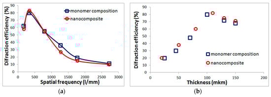 The dependence of diffraction efficiency on the recording frequency (a) and layer thickness (b) for the monomer composition and the nanocomposite with silicon oxide.
