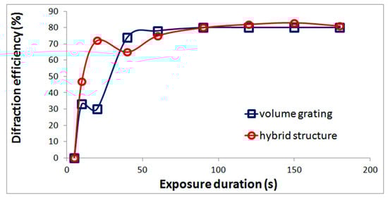 Dependence of diffraction efficiency on exposure duration for a volume grating and a hybrid structure recorded in the monomer composition.