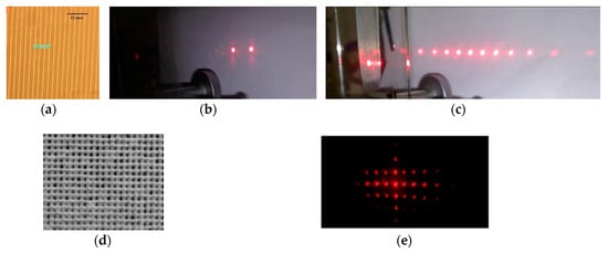 Examples of structures of two and multichannel splitters, recorded in the nanocomposite with silicon oxide and diffraction patterns. (a,b) Structure of a volume one-dimensional grating and diffraction pattern (the period is 3 μm, thickness is 100 μm); (c) Diffraction pattern on a thin one-dimensional grating (the period is 6 μm, thickness is 20 μm); (d,e) Structure of a thin two-dimensional grating and diffraction pattern.