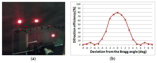 (a) The dependence of the diffraction efficiency of the volume grating recorded in the Bayfol HX on the angles α and β; (b) scheme explaining the grating position and variable angles of incidence.